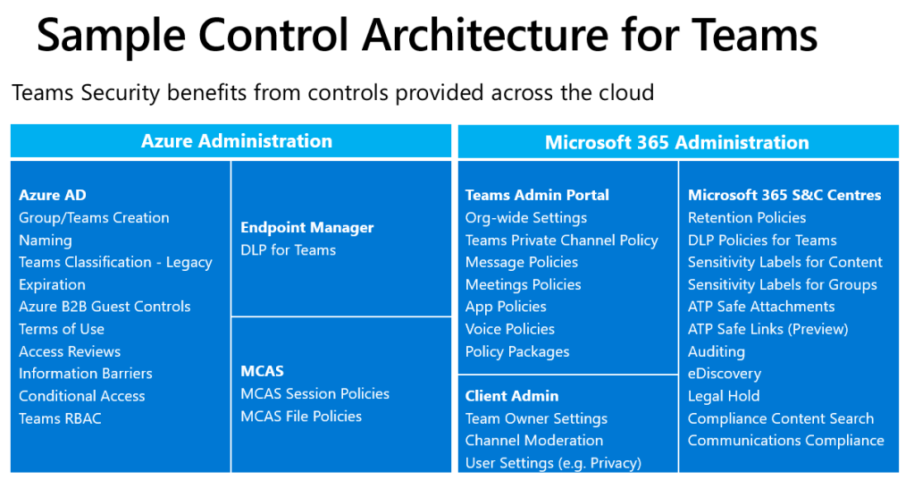 One of the things that I personally like about Microsoft Teams from an architect’s perspective is that the service leverages existing Microsoft 365 and Azure AD security capabilities. From an Admin’s perspective, the security features available for other Microsoft 365 services such as EXO and SPO are, when relevant, directly applicable to Teams.