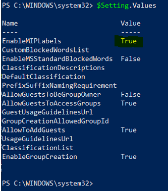 Enabling Sensitivity Labels in a Tenant: At the time of writing I had to enable MIP (Microsoft Information Protection) in my tenant to turn on Sensitivity labels. Some getting started documentations is provided here. I’ve pasted a screenshot of the Group.Unified template with MIP enabled below: